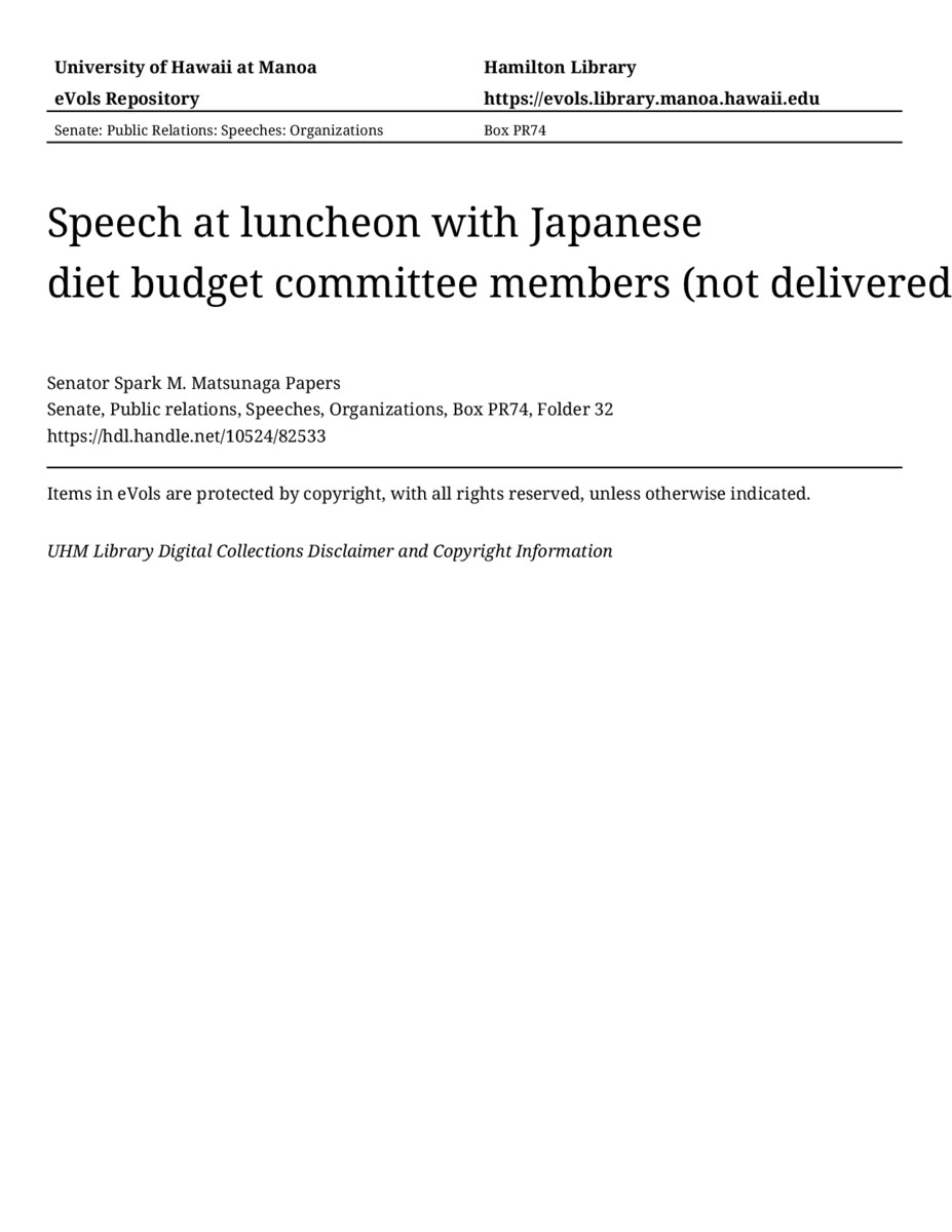 - Speech at luncheon with Japanese diet budget committee members (not delivered)