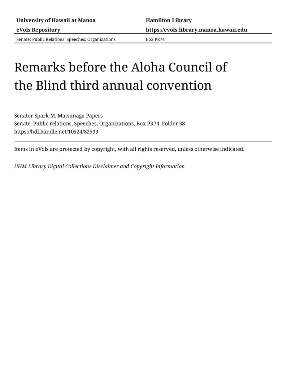 - Remarks before the Aloha Council of the Blind third annual convention