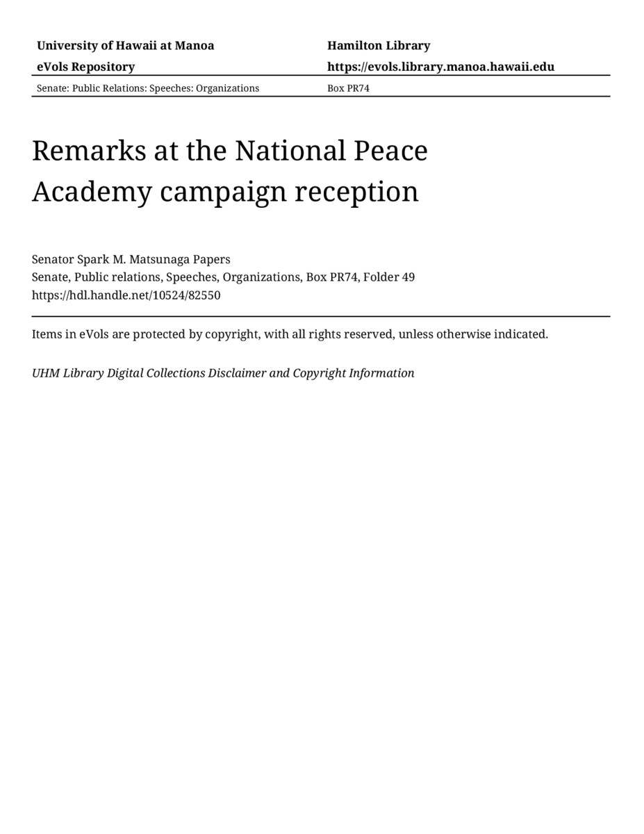 Remarks at the National Peace Academy campaign reception, 03/07/79, Senate, Public relations, Speeches, Organizations, Box PR74, Folder 49, Senator Spark M. Matsunaga Papers, Hawaiʻi Congressional Papers Collection, University of Hawaiʻi at Mānoa Library, Honolulu, HI. https://congressarchives.org/catalog/10524_82550 (accessed March 20, 2026).