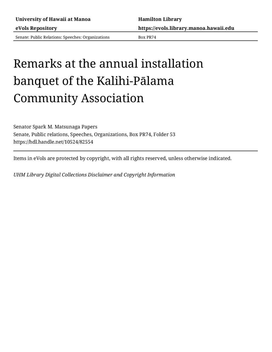 - Remarks at the annual installation banquet of the Kalihi-Pālama Community Association