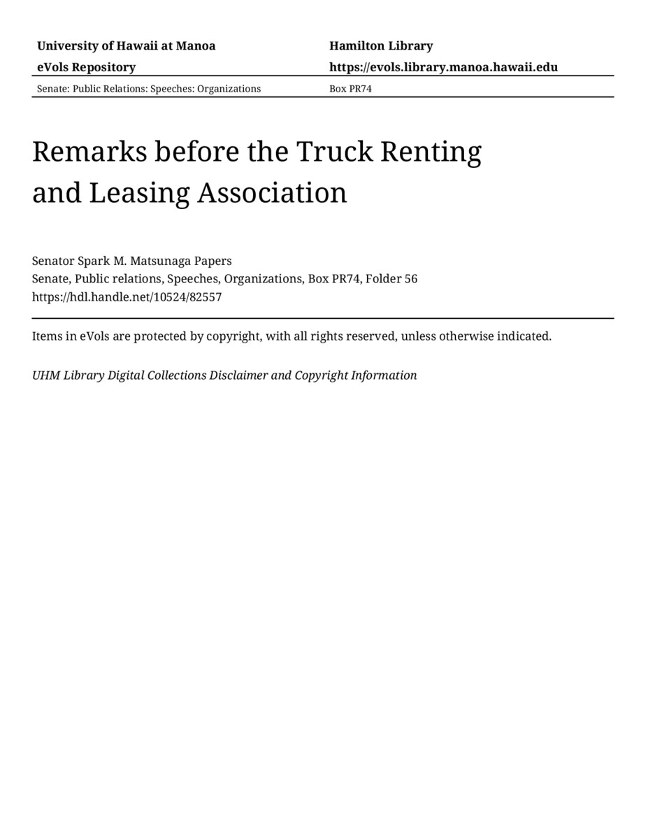 Remarks before the Truck Renting and Leasing Association, 04/23/79, Senate, Public relations, Speeches, Organizations, Box PR74, Folder 56, Senator Spark M. Matsunaga Papers, Hawaiʻi Congressional Papers Collection, University of Hawaiʻi at Mānoa Library, Honolulu, HI. https://congressarchives.org/catalog/10524_82557 (accessed March 19, 2026).