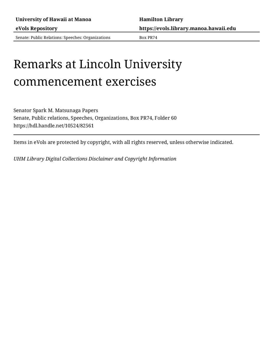 Remarks at Lincoln University commencement exercises, 05/20/79, Senate, Public relations, Speeches, Organizations, Box PR74, Folder 60, Senator Spark M. Matsunaga Papers, Hawaiʻi Congressional Papers Collection, University of Hawaiʻi at Mānoa Library, Honolulu, HI. https://congressarchives.org/catalog/10524_82561 (accessed March 20, 2026).