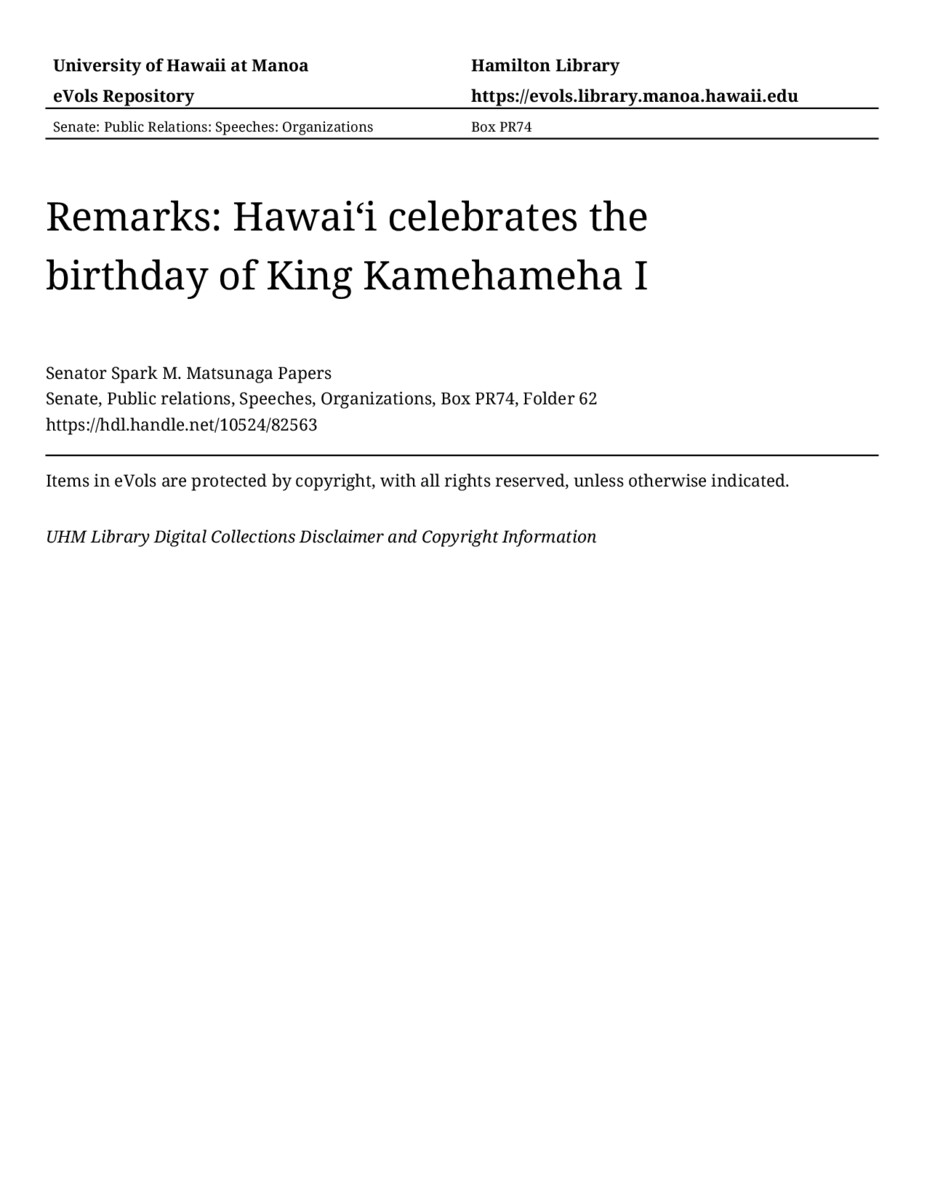 Remarks: Hawaiʻi celebrates the birthday of King Kamehameha I, 06/12/79, Senate, Public relations, Speeches, Organizations, Box PR74, Folder 62, Senator Spark M. Matsunaga Papers, Hawaiʻi Congressional Papers Collection, University of Hawaiʻi at Mānoa Library, Honolulu, HI. https://congressarchives.org/catalog/10524_82563 (accessed March 19, 2026).