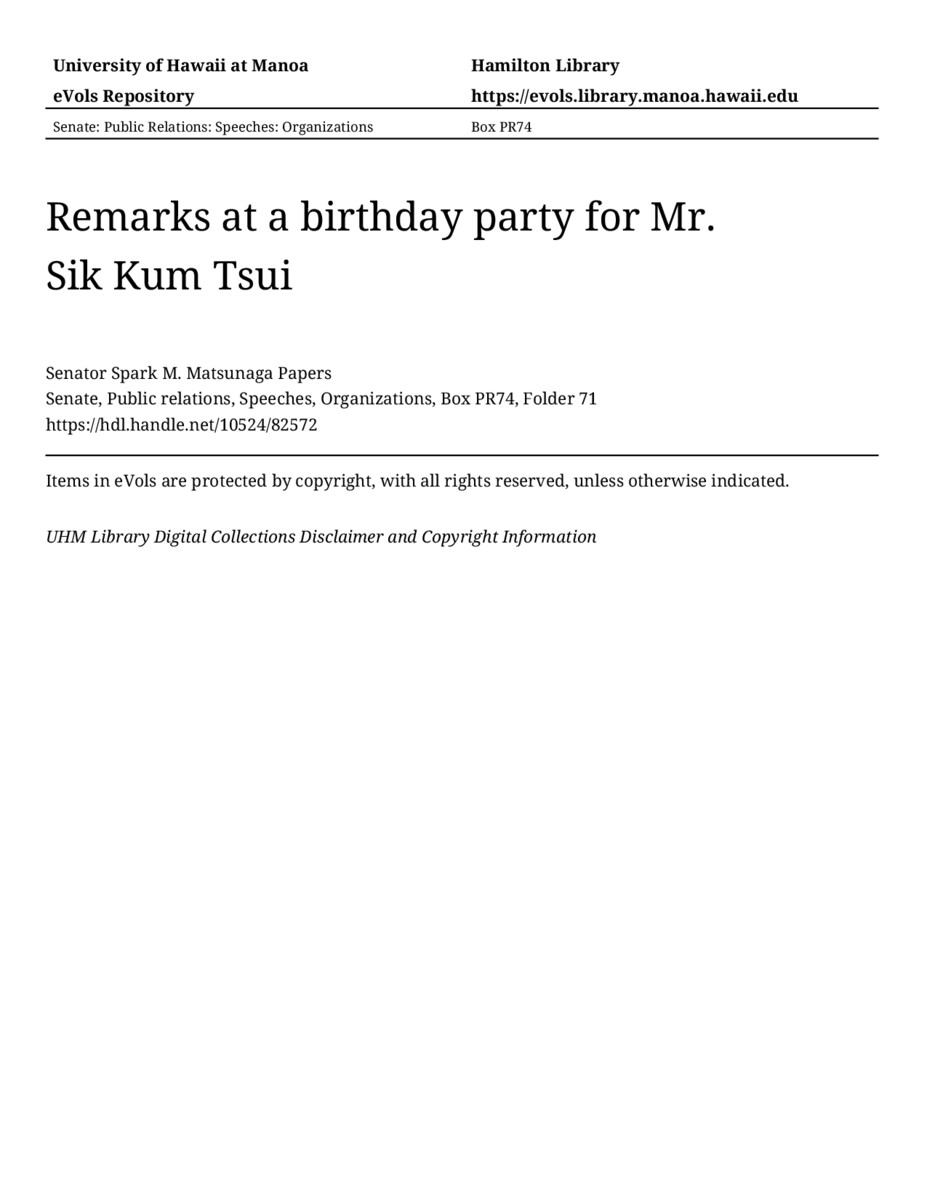Remarks at a birthday party for Mr. Sik Kum Tsui, 08/31/79, Senate, Public relations, Speeches, Organizations, Box PR74, Folder 71, Senator Spark M. Matsunaga Papers, Hawaiʻi Congressional Papers Collection, University of Hawaiʻi at Mānoa Library, Honolulu, HI. https://congressarchives.org/catalog/10524_82572 (accessed March 20, 2026).