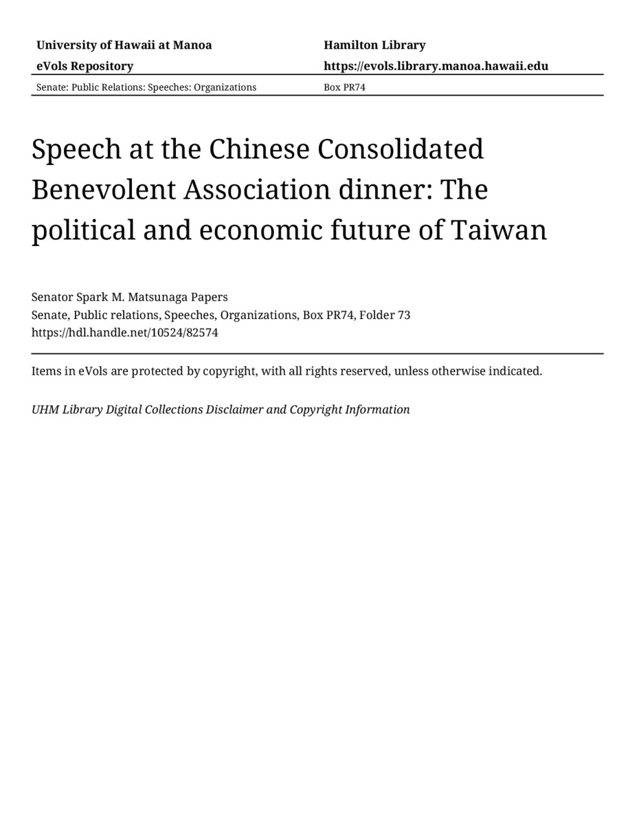 - Speech at the Chinese Consolidated Benevolent Association dinner: The political and economic future of Taiwan