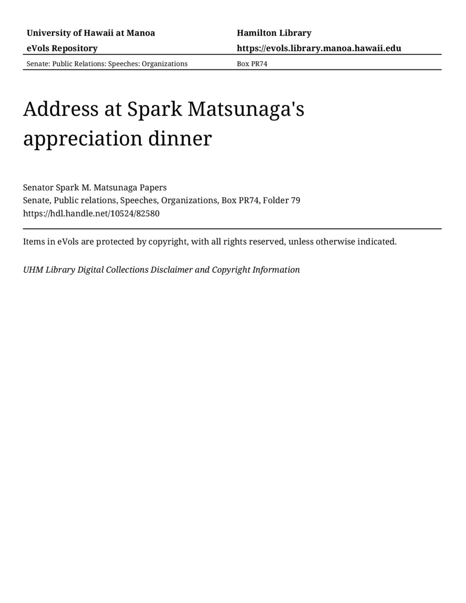 Address at Spark Matsunaga's appreciation dinner, 11/19/79, Senate, Public relations, Speeches, Organizations, Box PR74, Folder 79, Senator Spark M. Matsunaga Papers, Hawaiʻi Congressional Papers Collection, University of Hawaiʻi at Mānoa Library, Honolulu, HI. https://congressarchives.org/catalog/10524_82580 (accessed March 22, 2026).