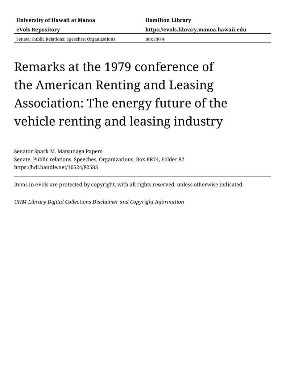Remarks at the 1979 conference of the American Renting and Leasing Association: The energy future of the vehicle renting and leasing industry, 11/20/79, Senate, Public relations, Speeches, Organizations, Box PR74, Folder 82, Senator Spark M. Matsunaga Papers, Hawaiʻi Congressional Papers Collection, University of Hawaiʻi at Mānoa Library, Honolulu, HI. https://congressarchives.org/catalog/10524_82583 (accessed March 22, 2026).