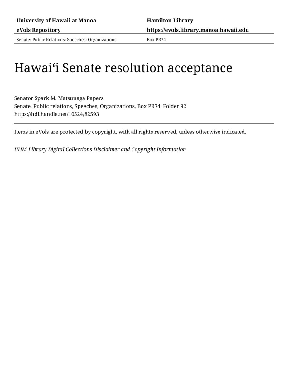 Hawaiʻi Senate resolution acceptance, 02/29/80, Senate, Public relations, Speeches, Organizations, Box PR74, Folder 92, Senator Spark M. Matsunaga Papers, Hawaiʻi Congressional Papers Collection, University of Hawaiʻi at Mānoa Library, Honolulu, HI. https://congressarchives.org/catalog/10524_82593 (accessed March 20, 2026).