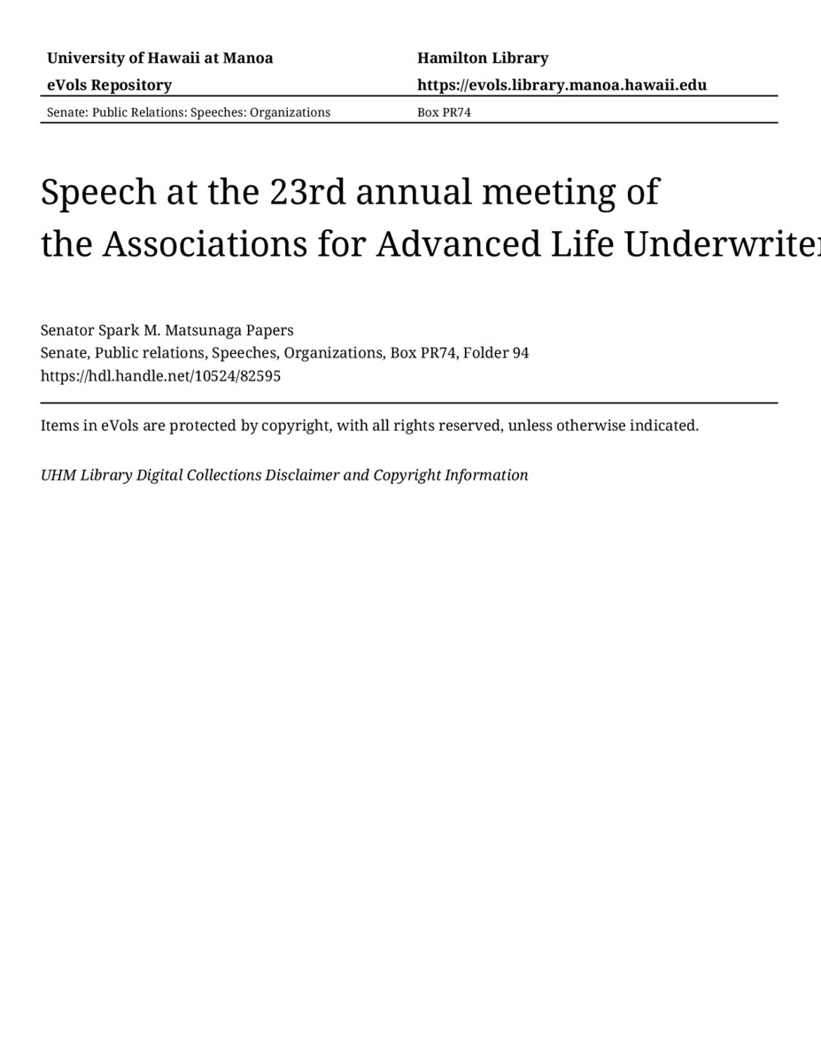 - Speech at the 23rd annual meeting of the Associations for Advanced Life Underwriters