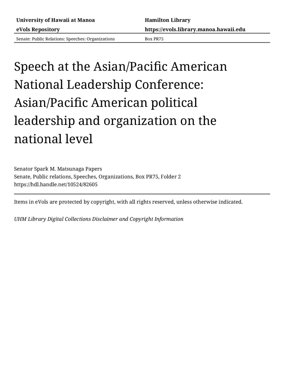 Speech at the Asian/Pacific American National Leadership Conference: Asian/Pacific American political leadership and organization on the national level, 05/21/80, Senate, Public relations, Speeches, Organizations, Box PR75, Folder 2, Senator Spark M. Matsunaga Papers, Hawaiʻi Congressional Papers Collection, University of Hawaiʻi at Mānoa Library, Honolulu, HI. https://congressarchives.org/catalog/10524_82605 (accessed March 21, 2026).