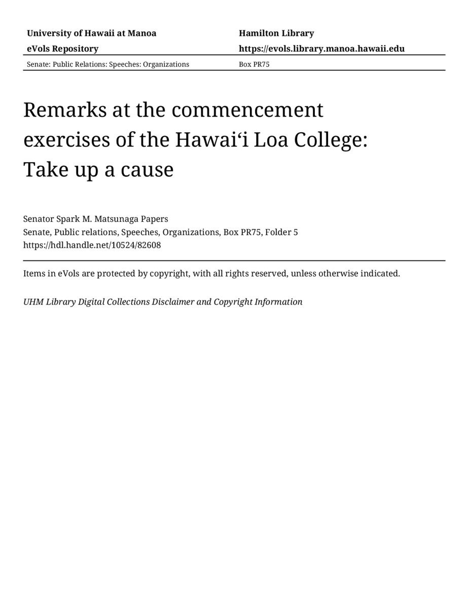 - Remarks at the commencement exercises of the Hawaiʻi Loa College: Take up a cause