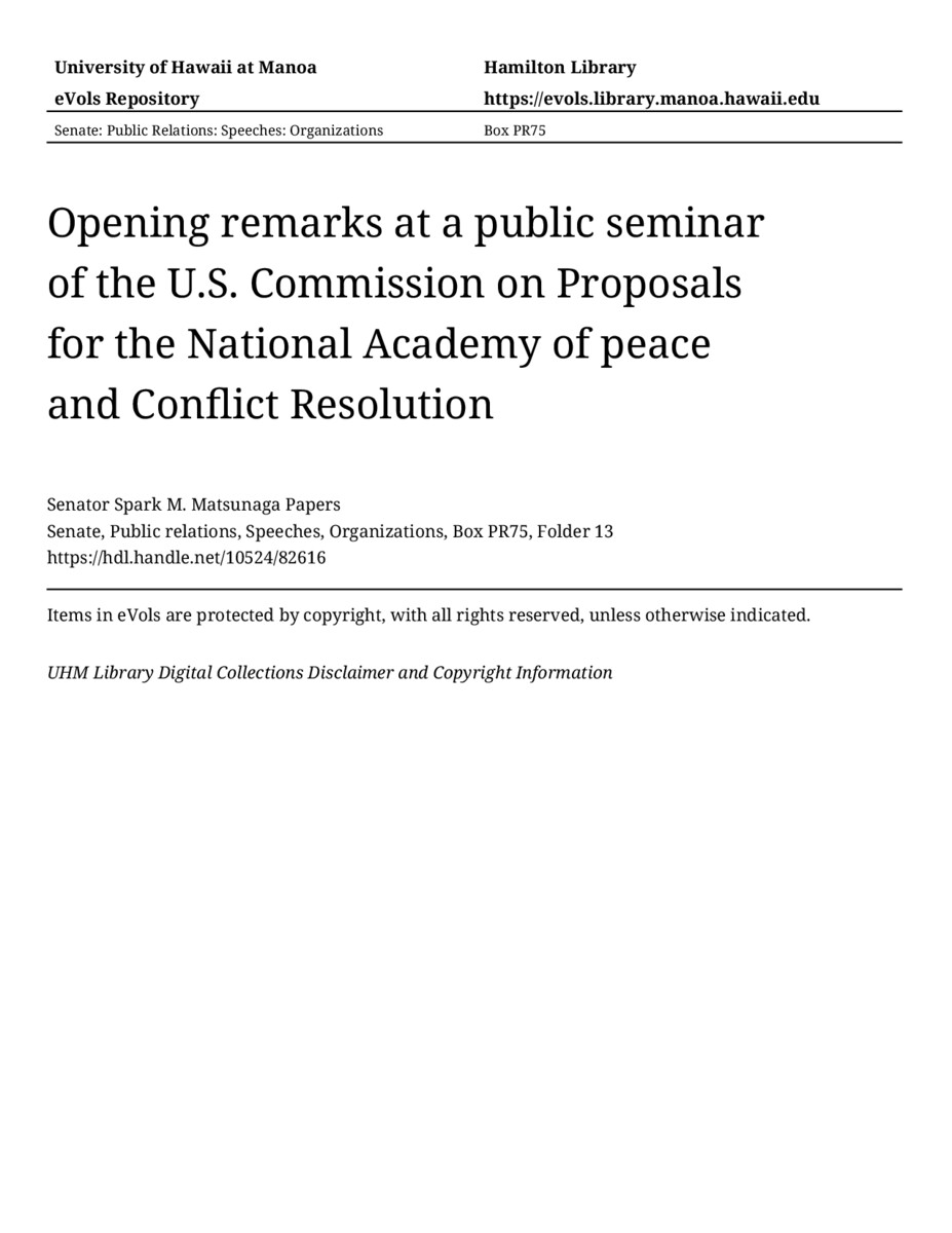 - Opening remarks at a public seminar of the U.S. Commission on Proposals for the National Academy of peace and Conflict Resolution