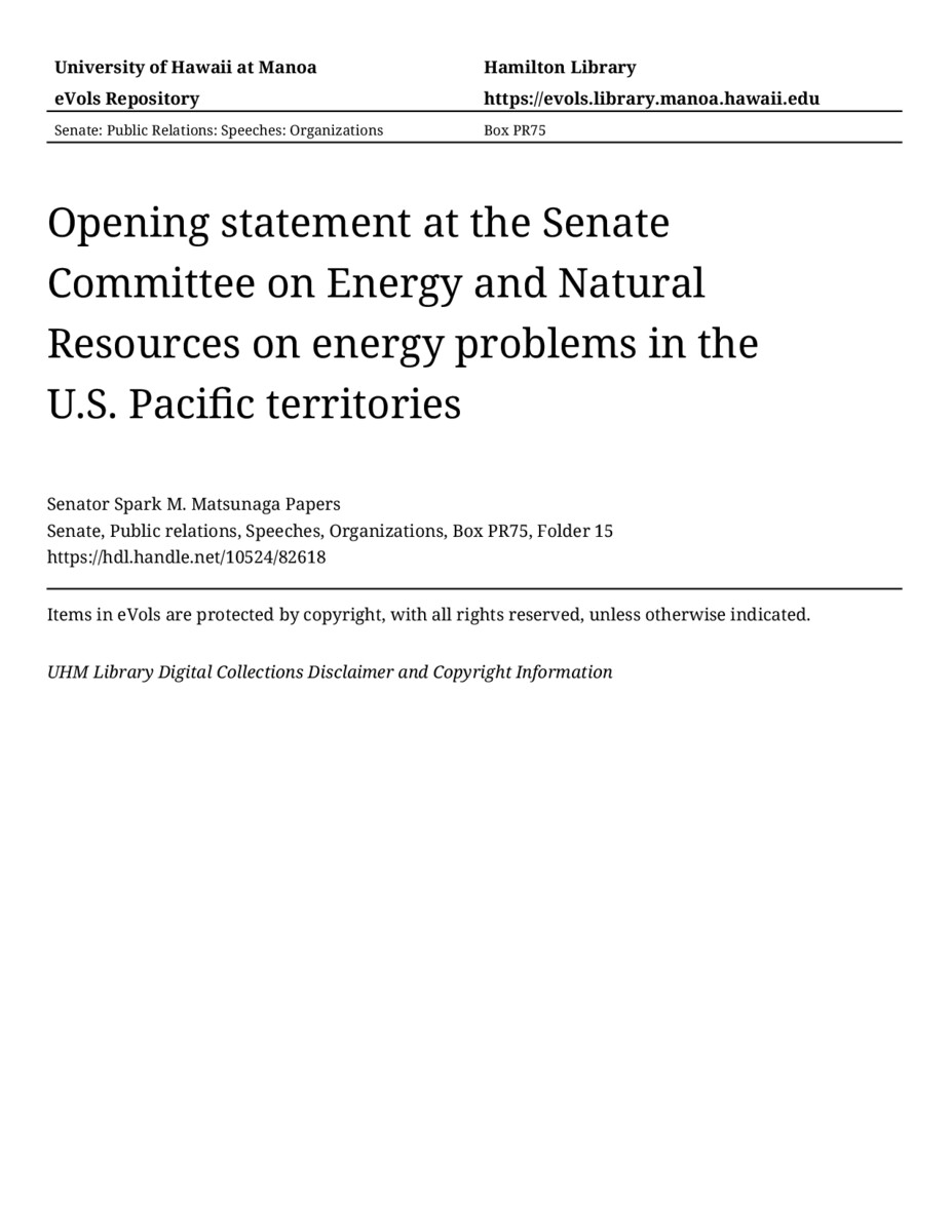 - Opening statement at the Senate Committee on Energy and Natural Resources on energy problems in the U.S. Pacific territories