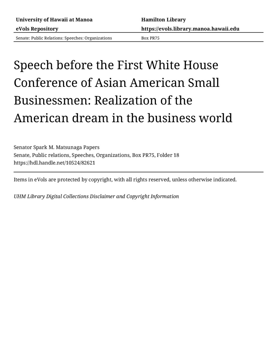 Speech before the First White House Conference of Asian American Small Businessmen: Realization of the American dream in the business world