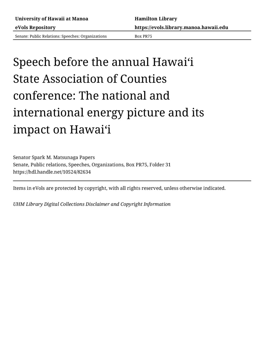 Speech before the annual Hawaiʻi State Association of Counties conference: The national and international energy picture and its impact on Hawaiʻi, 12/04/80, Senate, Public relations, Speeches, Organizations, Box PR75, Folder 31, Senator Spark M. Matsunaga Papers, Hawaiʻi Congressional Papers Collection, University of Hawaiʻi at Mānoa Library, Honolulu, HI. https://congressarchives.org/catalog/10524_82634 (accessed March 20, 2026).
