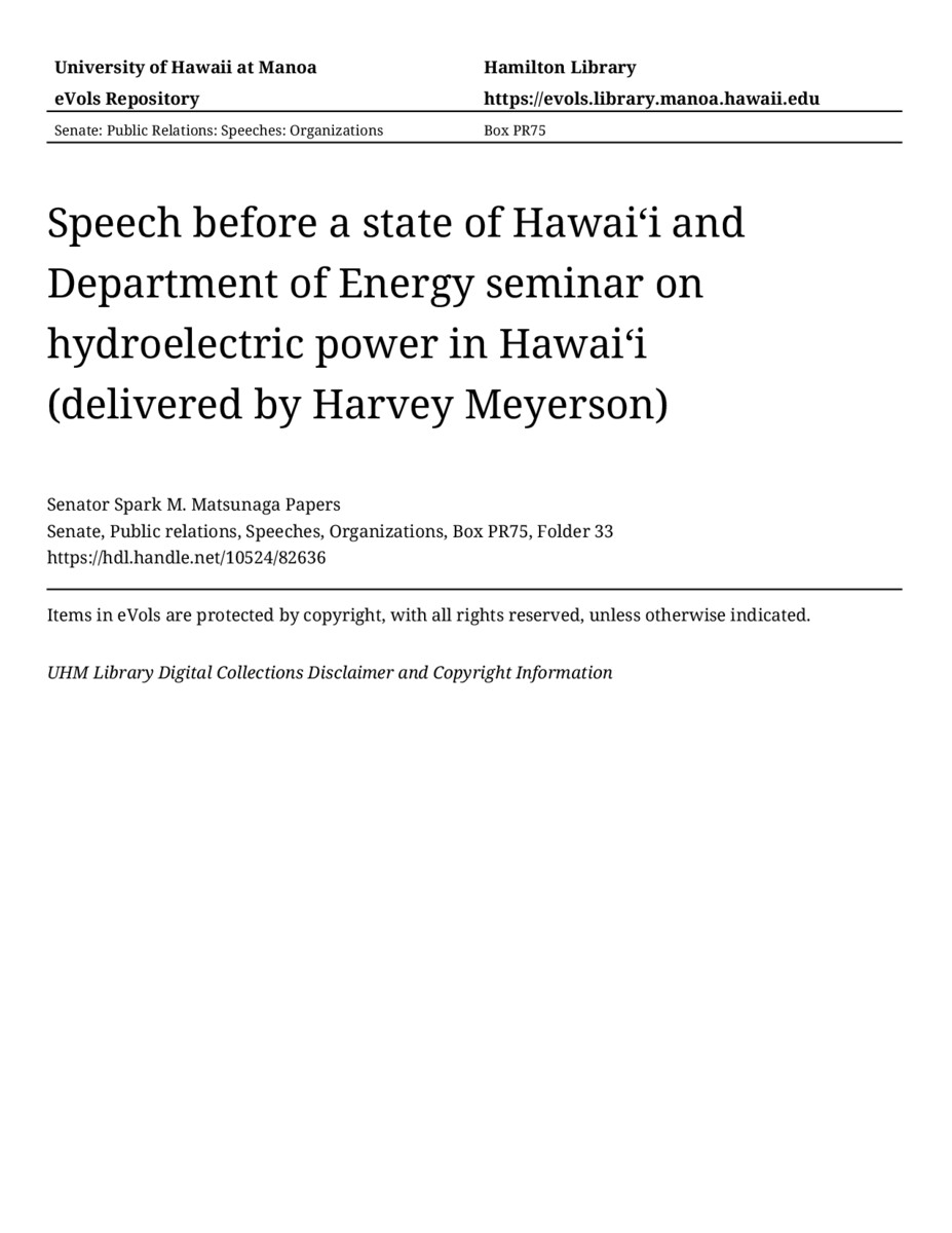 Speech before a state of Hawaiʻi and Department of Energy seminar on hydroelectric power in Hawaiʻi (delivered by Harvey Meyerson)