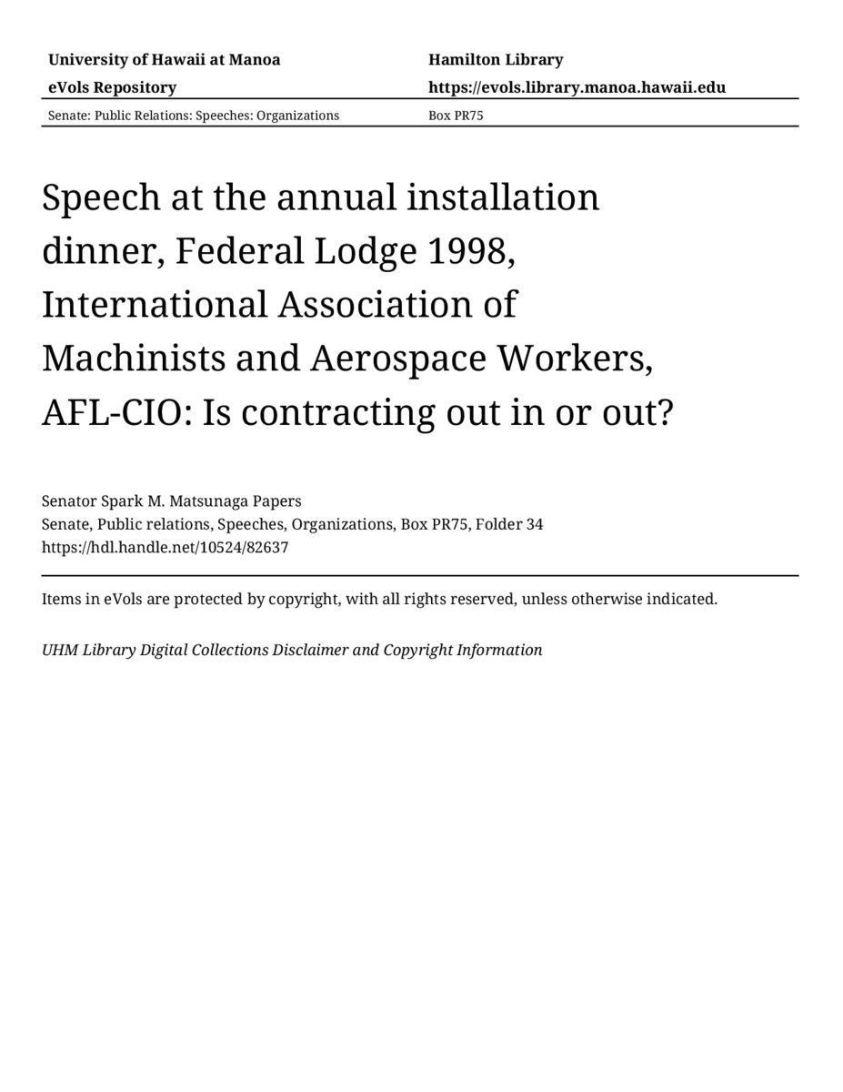 Speech at the annual installation dinner, Federal Lodge 1998, International Association of Machinists and Aerospace Workers, AFL-CIO: Is contracting out in or out?, 01/10/81, Senate, Public relations, Speeches, Organizations, Box PR75, Folder 34, Senator Spark M. Matsunaga Papers, Hawaiʻi Congressional Papers Collection, University of Hawaiʻi at Mānoa Library, Honolulu, HI. https://congressarchives.org/catalog/10524_82637 (accessed March 16, 2026).