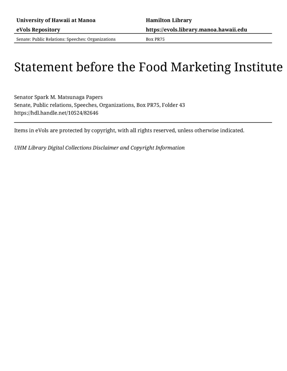 Statement before the Food Marketing Institute, 03/31/81, Senate, Public relations, Speeches, Organizations, Box PR75, Folder 43, Senator Spark M. Matsunaga Papers, Hawaiʻi Congressional Papers Collection, University of Hawaiʻi at Mānoa Library, Honolulu, HI. https://congressarchives.org/catalog/10524_82646 (accessed March 17, 2026).