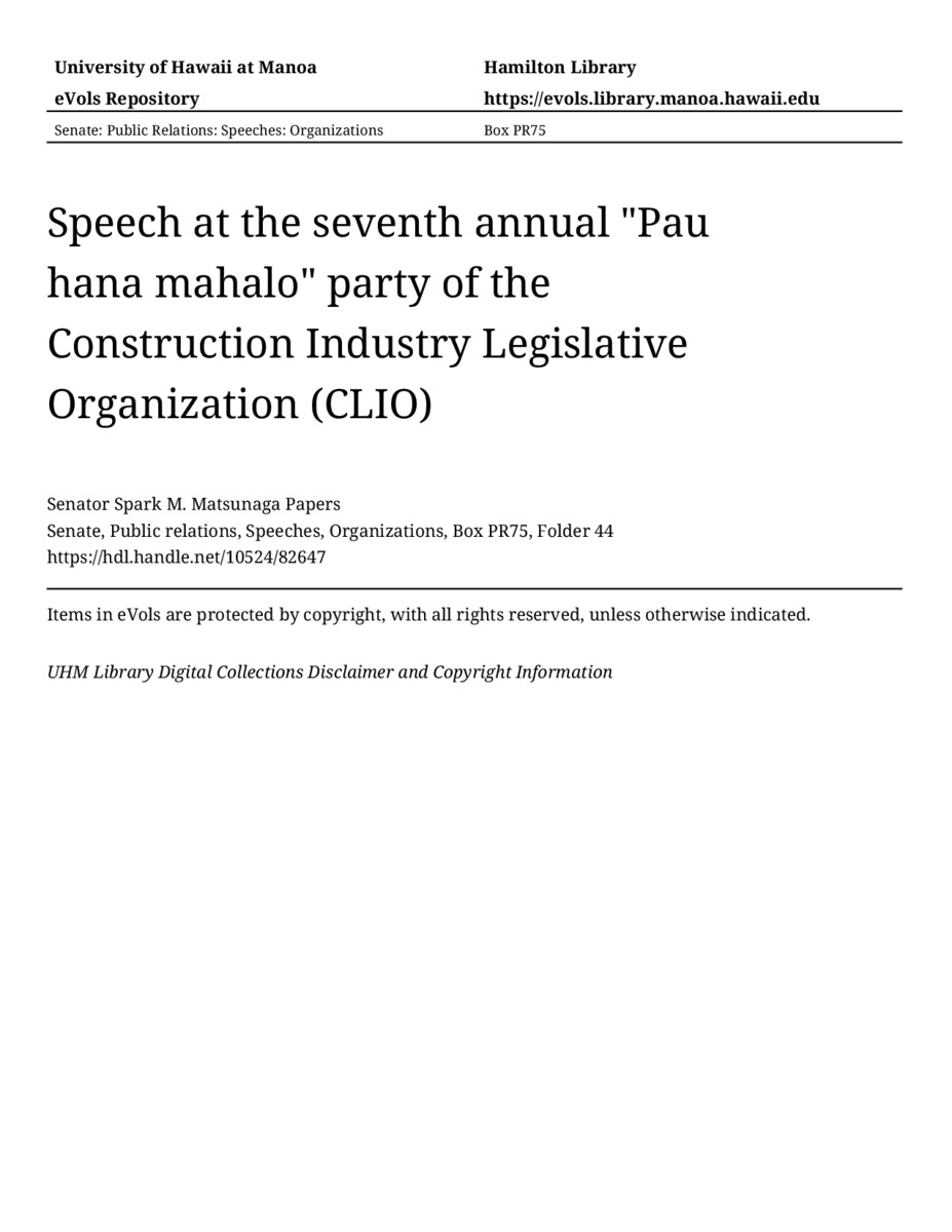 - Speech at the seventh annual "Pau hana mahalo" party of the Construction Industry Legislative Organization (CLIO)
