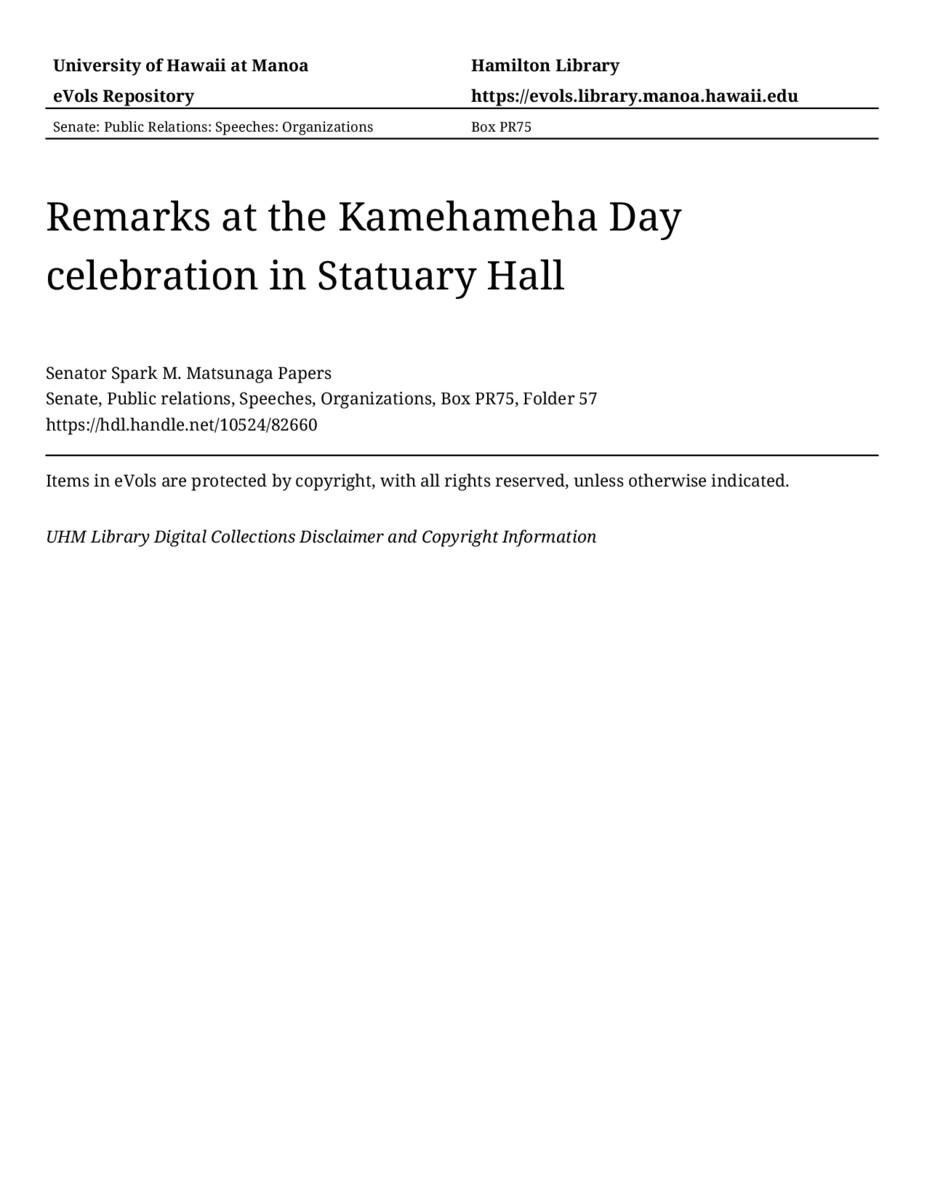 Remarks at the Kamehameha Day celebration in Statuary Hall, 06/11/81, Senate, Public relations, Speeches, Organizations, Box PR75, Folder 57, Senator Spark M. Matsunaga Papers, Hawaiʻi Congressional Papers Collection, University of Hawaiʻi at Mānoa Library, Honolulu, HI. https://congressarchives.org/catalog/10524_82660 (accessed March 20, 2026).