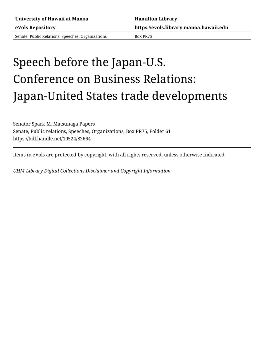 - Speech before the Japan-U.S. Conference on Business Relations: Japan-United States trade developments