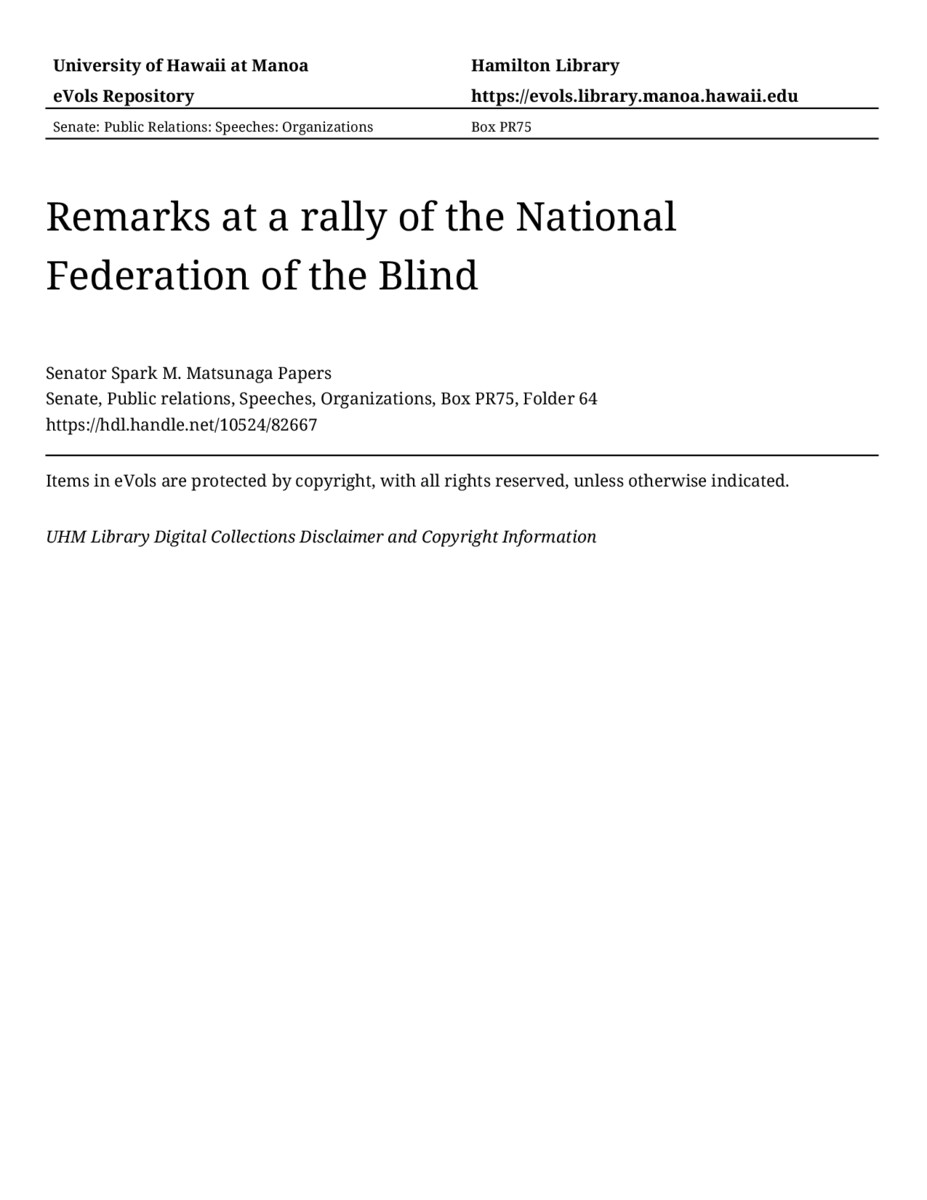Remarks at a rally of the National Federation of the Blind, 07/08/81, Senate, Public relations, Speeches, Organizations, Box PR75, Folder 64, Senator Spark M. Matsunaga Papers, Hawaiʻi Congressional Papers Collection, University of Hawaiʻi at Mānoa Library, Honolulu, HI. https://congressarchives.org/catalog/10524_82667 (accessed March 21, 2026).