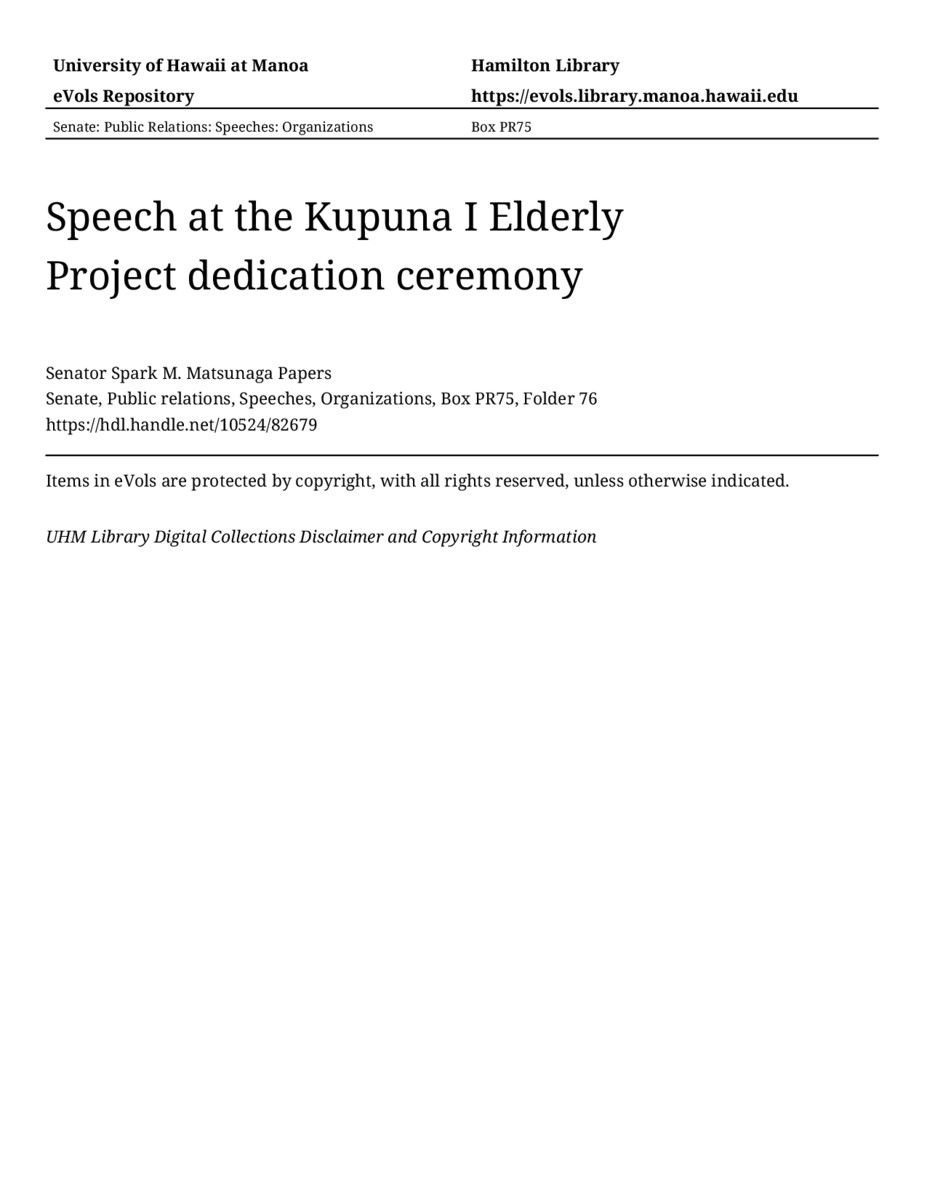 Speech at the Kupuna I Elderly Project dedication ceremony, 09/02/81, Senate, Public relations, Speeches, Organizations, Box PR75, Folder 76, Senator Spark M. Matsunaga Papers, Hawaiʻi Congressional Papers Collection, University of Hawaiʻi at Mānoa Library, Honolulu, HI. https://congressarchives.org/catalog/10524_82679 (accessed March 21, 2026).