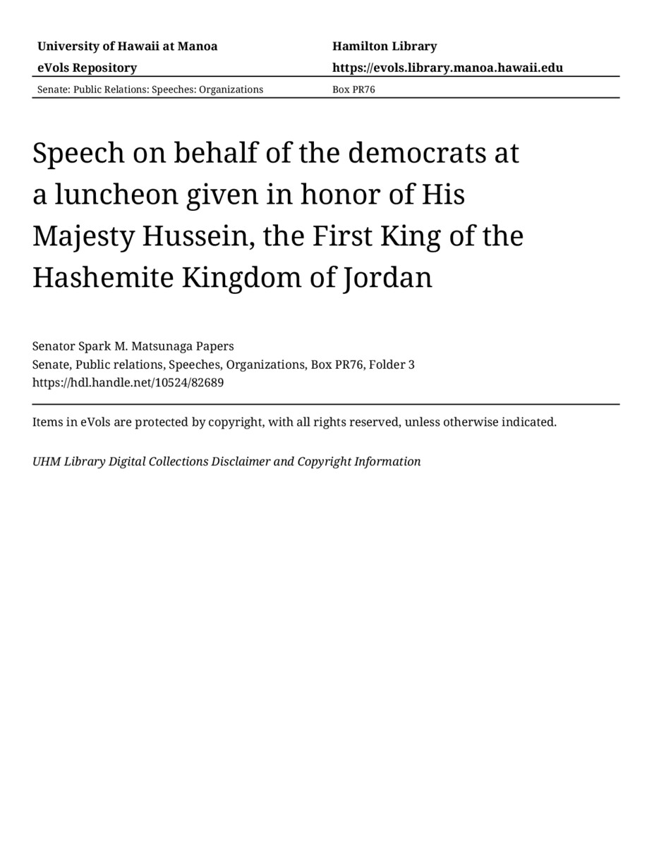 - Speech on behalf of the democrats at a luncheon given in honor of His Majesty Hussein, the First King of the Hashemite Kingdom of Jordan