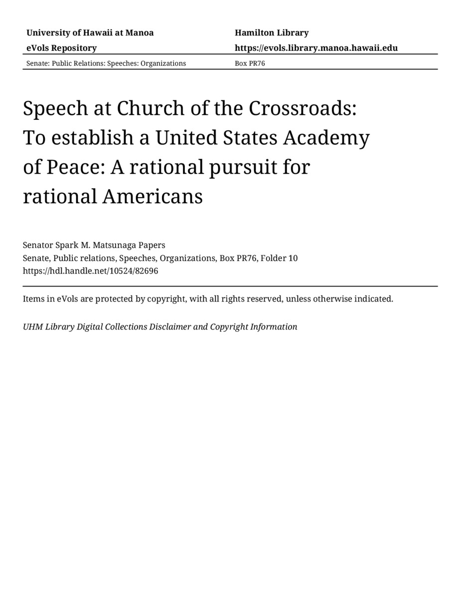 - Speech at Church of the Crossroads: To establish a United States Academy of Peace: A rational pursuit for rational Americans