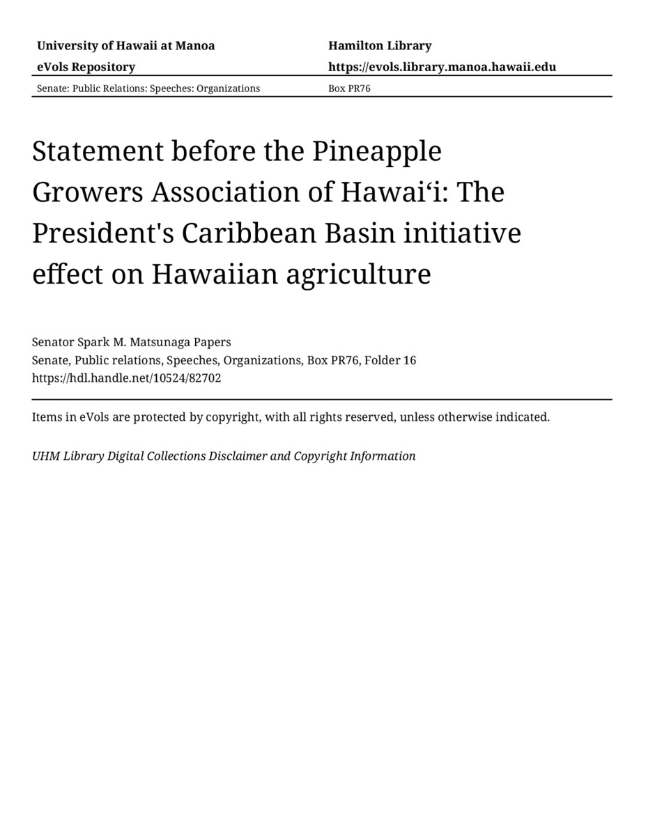 - Statement before the Pineapple Growers Association of Hawaiʻi: The President's Caribbean Basin initiative effect on Hawaiian agriculture