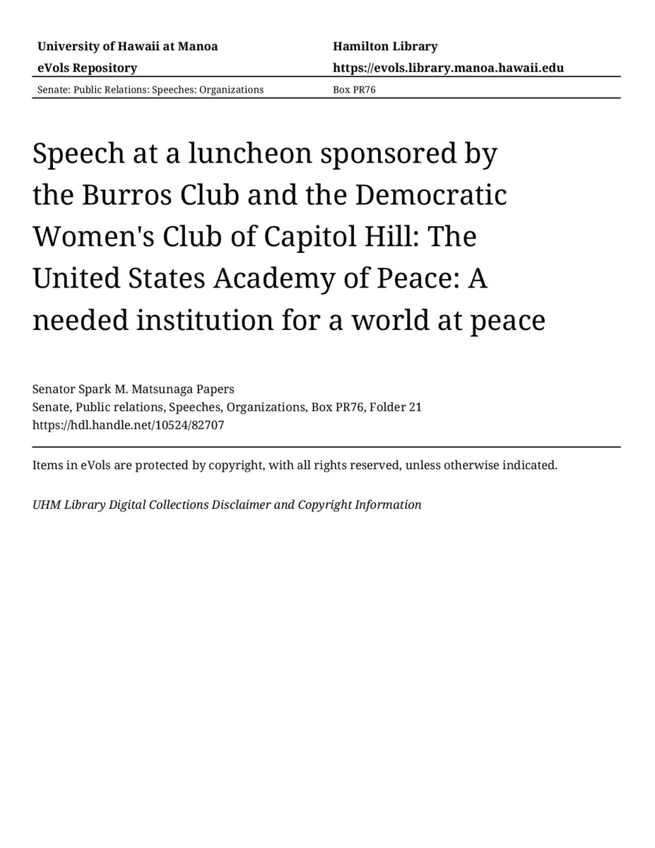 Speech at a luncheon sponsored by the Burros Club and the Democratic Women's Club of Capitol Hill: The United States Academy of Peace: A needed institution for a world at peace, 03/19/82, Senate, Public relations, Speeches, Organizations, Box PR76, Folder 21, Senator Spark M. Matsunaga Papers, Hawaiʻi Congressional Papers Collection, University of Hawaiʻi at Mānoa Library, Honolulu, HI. https://congressarchives.org/catalog/10524_82707 (accessed March 18, 2026).