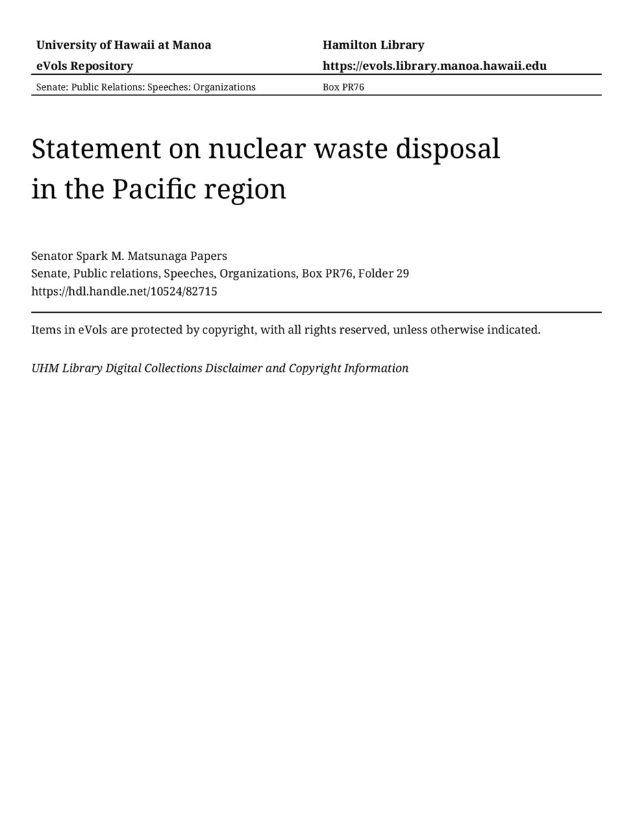 Statement on nuclear waste disposal in the Pacific region, 04/10/82, Senate, Public relations, Speeches, Organizations, Box PR76, Folder 29, Senator Spark M. Matsunaga Papers, Hawaiʻi Congressional Papers Collection, University of Hawaiʻi at Mānoa Library, Honolulu, HI. https://congressarchives.org/catalog/10524_82715 (accessed March 19, 2026).