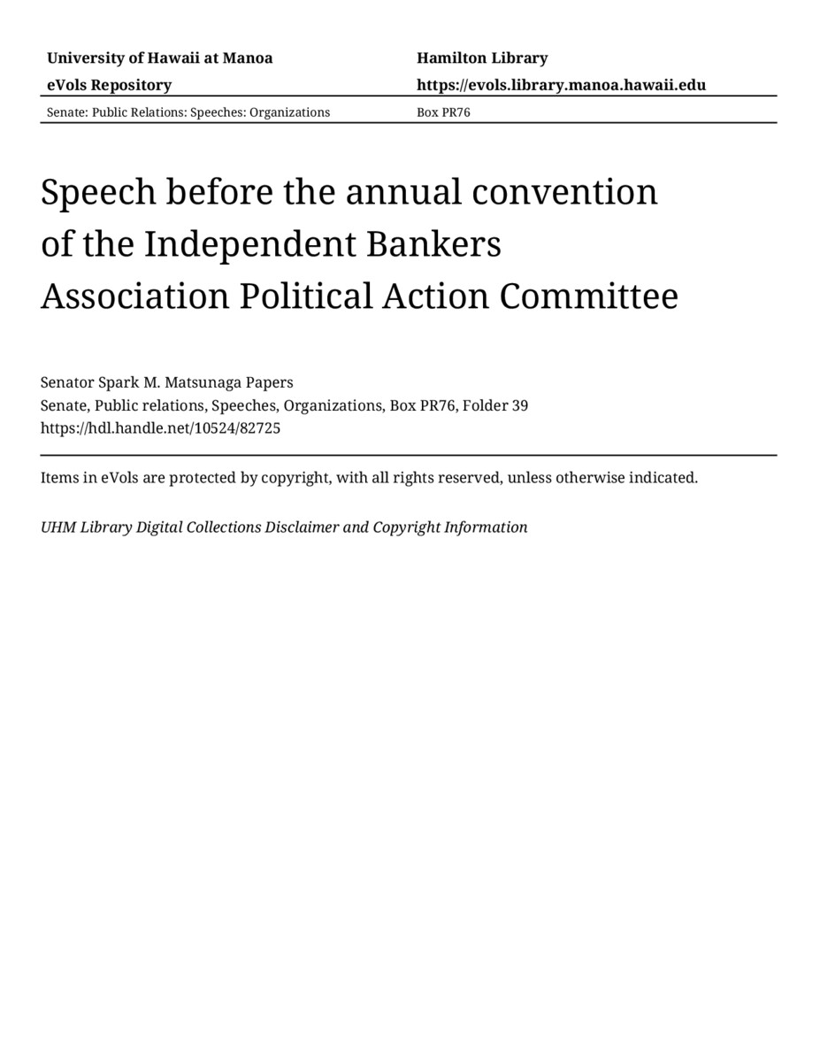 - Speech before the annual convention of the Independent Bankers Association Political Action Committee