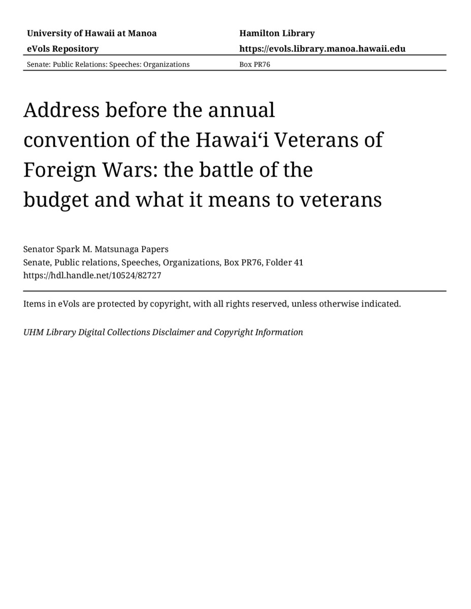 - Address before the annual convention of the Hawaiʻi Veterans of Foreign Wars: the battle of the budget and what it means to veterans