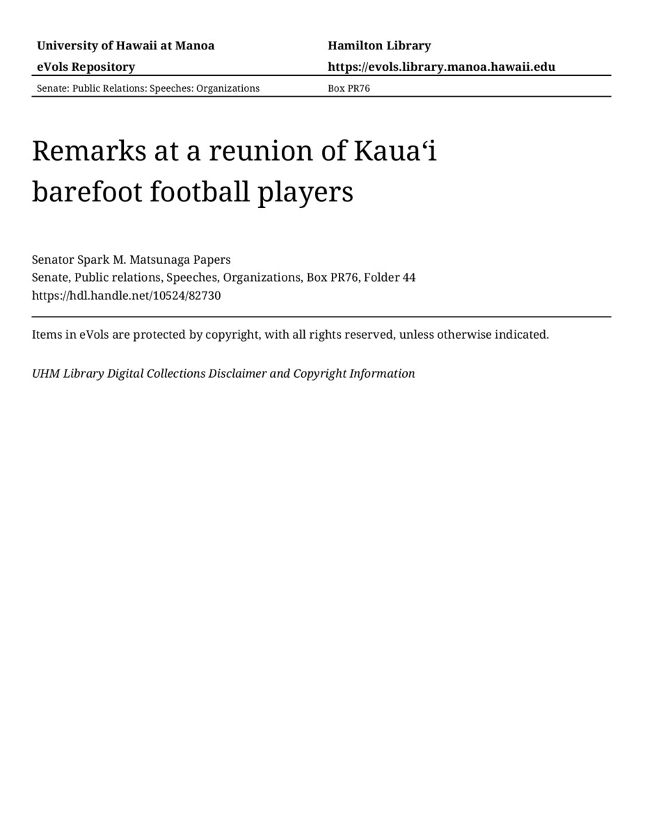 Remarks at a reunion of Kauaʻi barefoot football players, 07/10/82, Senate, Public relations, Speeches, Organizations, Box PR76, Folder 44, Senator Spark M. Matsunaga Papers, Hawaiʻi Congressional Papers Collection, University of Hawaiʻi at Mānoa Library, Honolulu, HI. https://congressarchives.org/catalog/10524_82730 (accessed March 20, 2026).