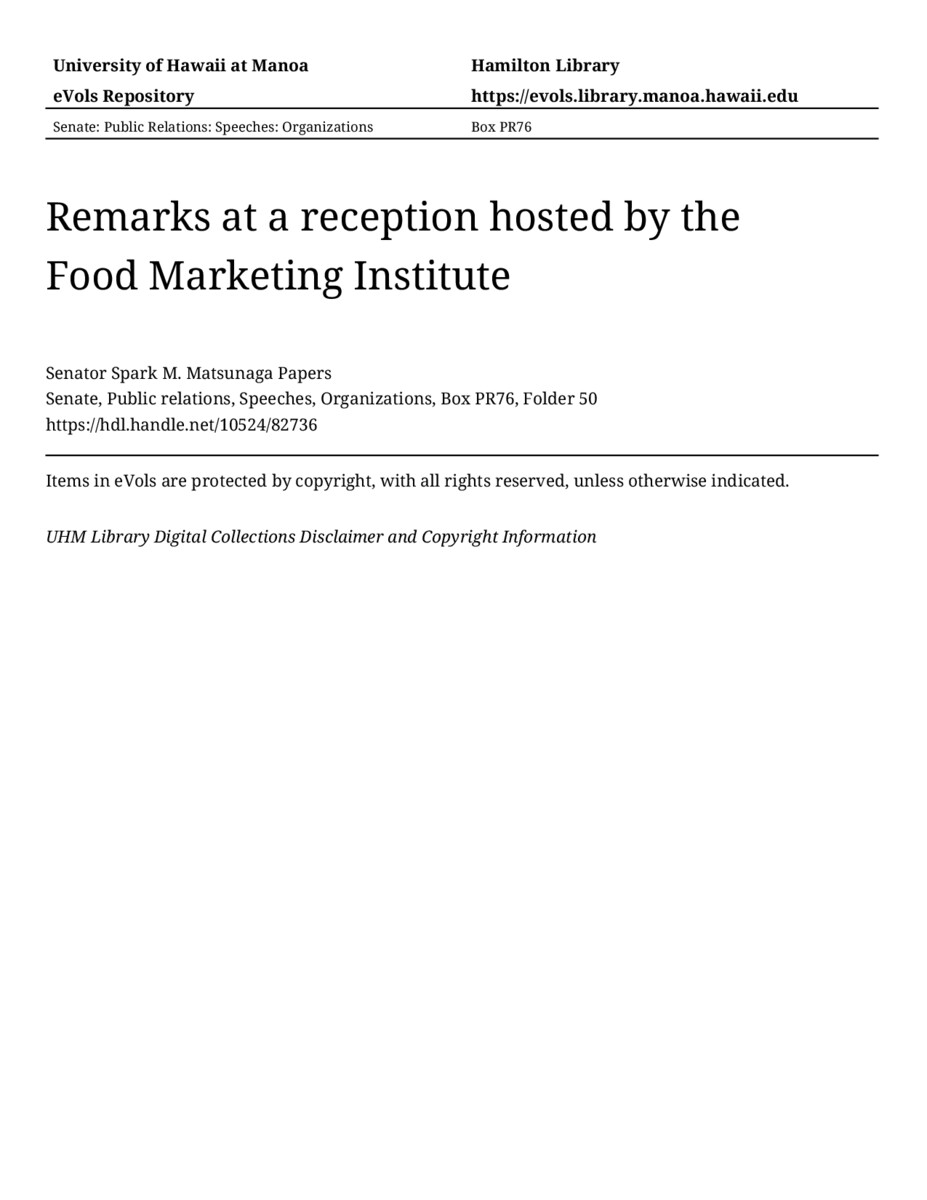 Remarks at a reception hosted by the Food Marketing Institute, 09/22/82, Senate, Public relations, Speeches, Organizations, Box PR76, Folder 50, Senator Spark M. Matsunaga Papers, Hawaiʻi Congressional Papers Collection, University of Hawaiʻi at Mānoa Library, Honolulu, HI. https://congressarchives.org/catalog/10524_82736 (accessed March 20, 2026).