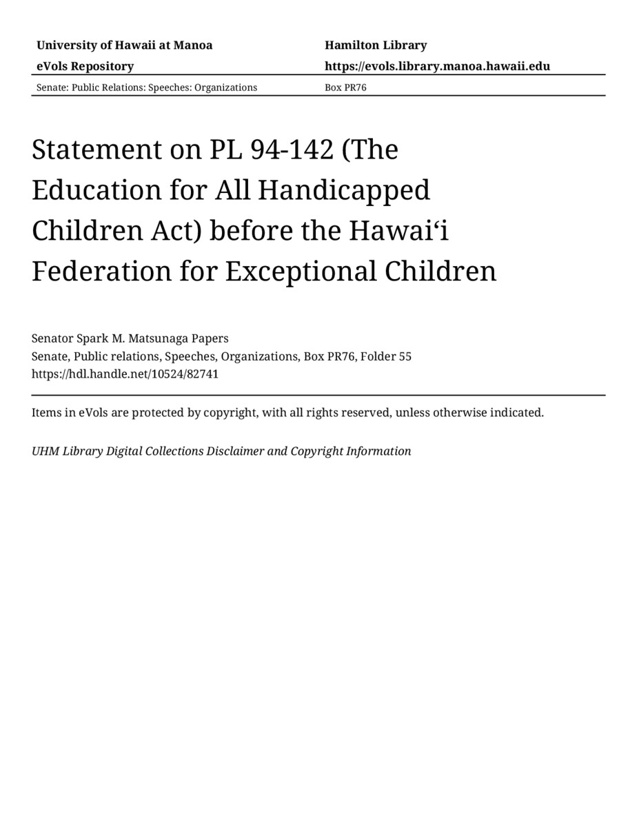 - Statement on PL 94-142 (The Education for All Handicapped Children Act) before the Hawaiʻi Federation for Exceptional Children