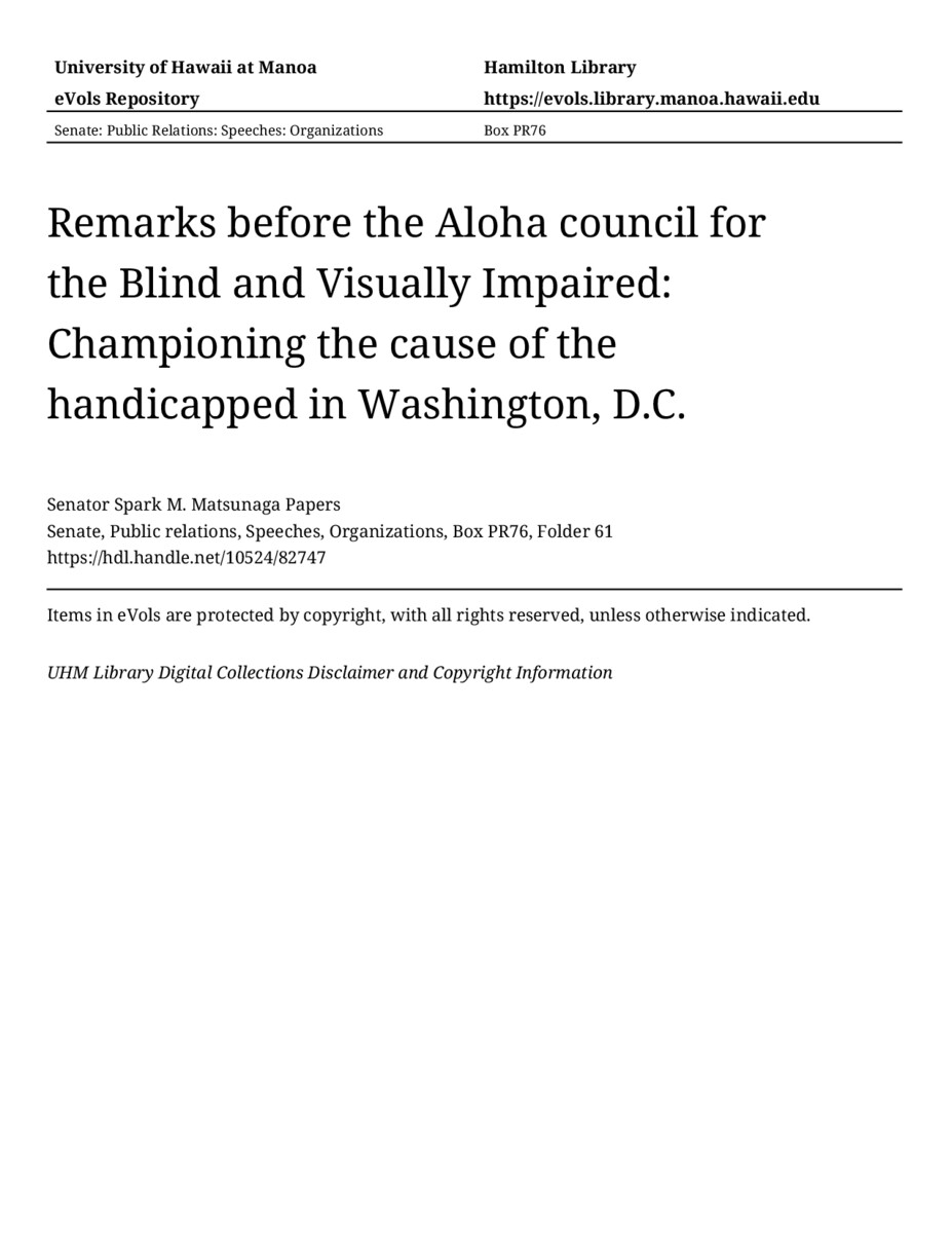 - Remarks before the Aloha council for the Blind and Visually Impaired: Championing the cause of the handicapped in Washington, D.C.