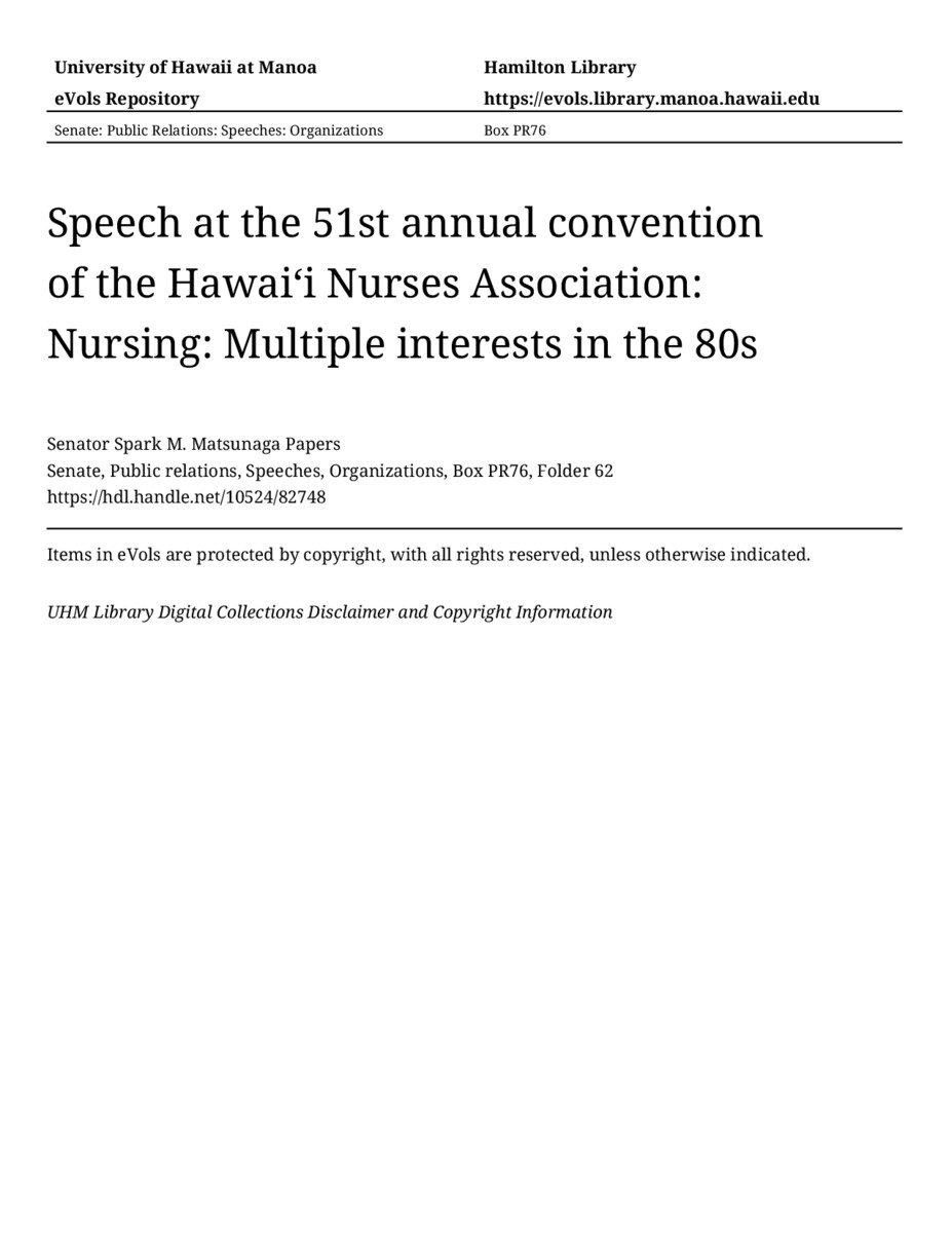 Speech at the 51st annual convention of the Hawaiʻi Nurses Association: Nursing: Multiple interests in the 80s