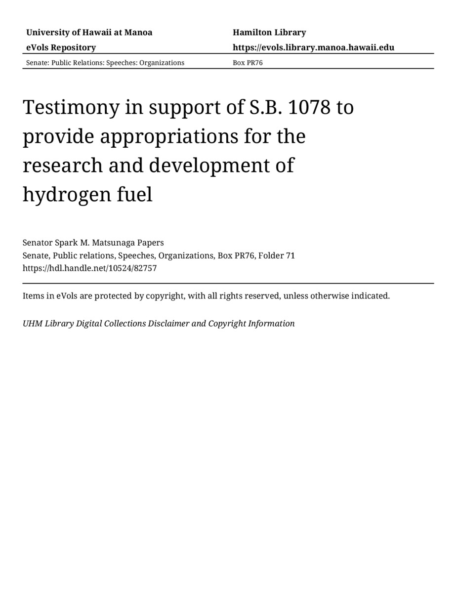 Testimony in support of S.B. 1078 to provide appropriations for the research and development of hydrogen fuel