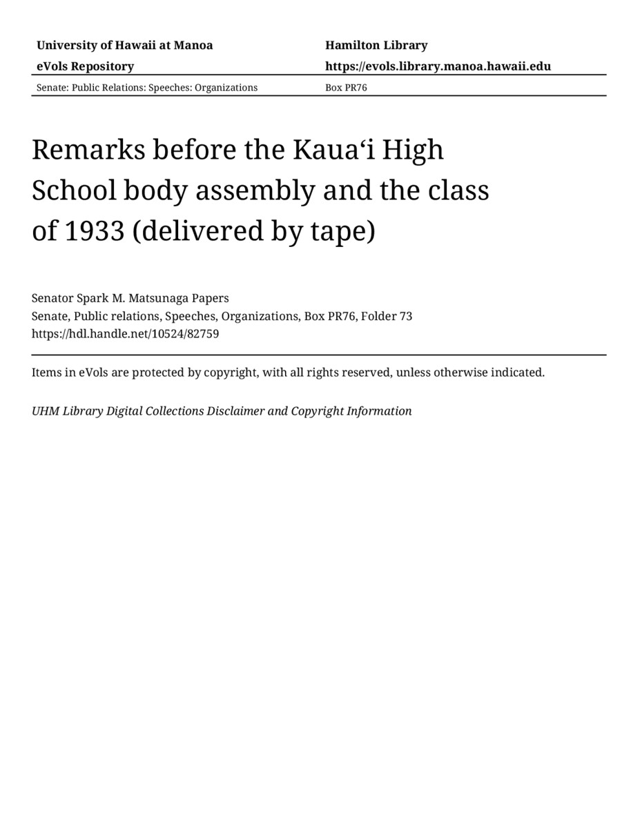- Remarks before the Kauaʻi High School body assembly and the class of 1933 (delivered by tape)