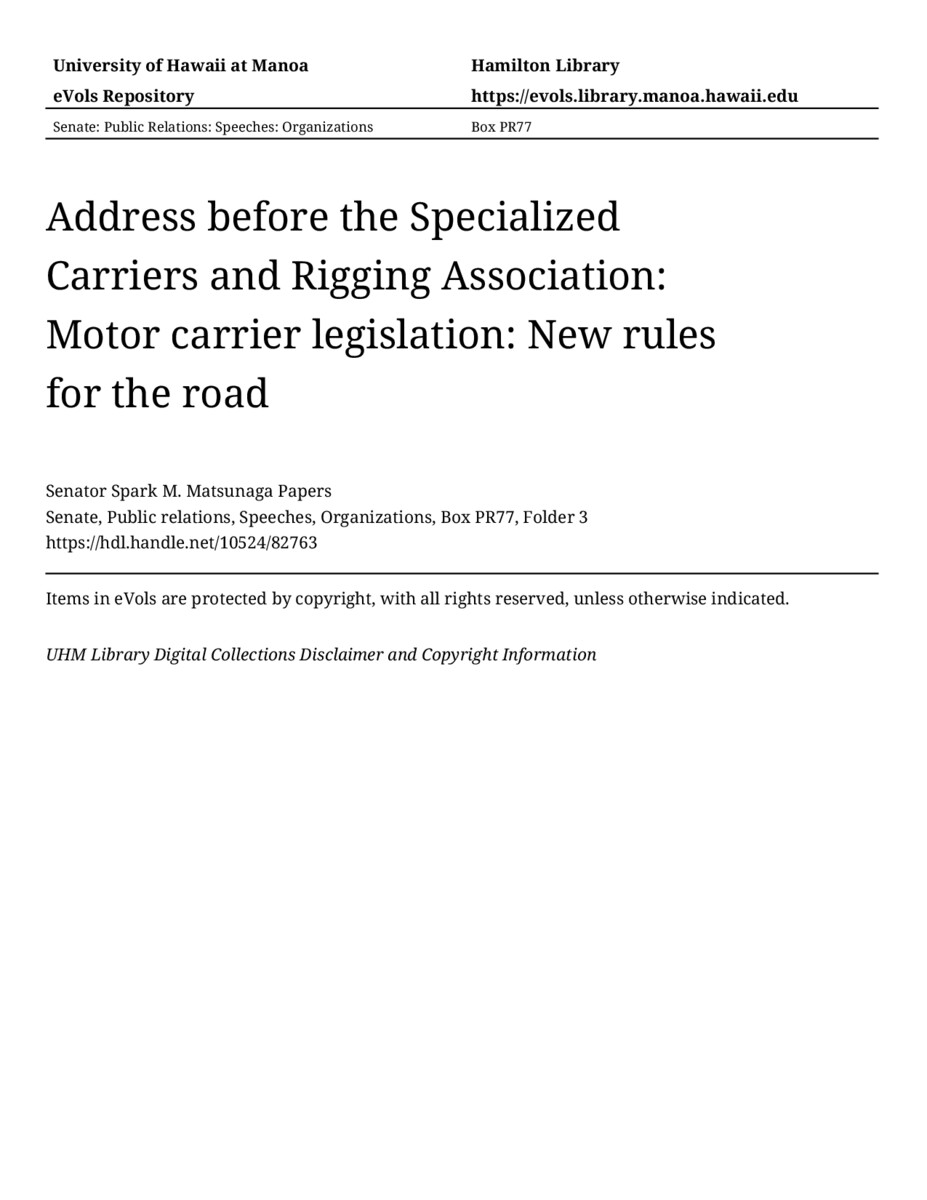 - Address before the Specialized Carriers and Rigging Association: Motor carrier legislation: New rules for the road