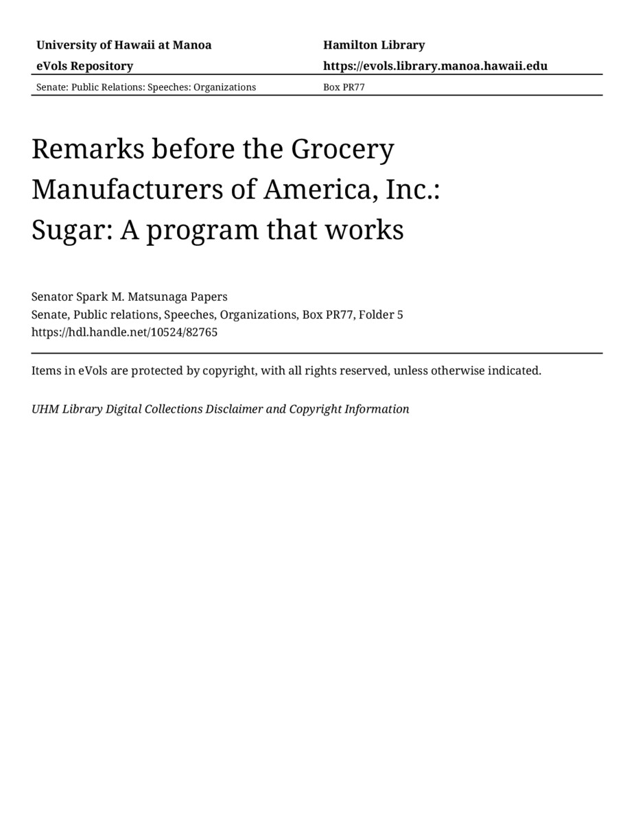 - Remarks before the Grocery Manufacturers of America, Inc.: Sugar: A program that works