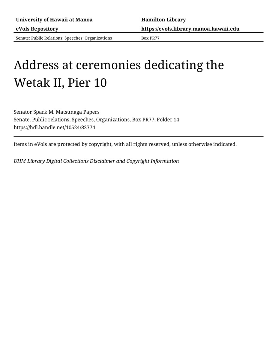 Address at ceremonies dedicating the Wetak II, Pier 10, 08/12/83, Senate, Public relations, Speeches, Organizations, Box PR77, Folder 14, Senator Spark M. Matsunaga Papers, Hawaiʻi Congressional Papers Collection, University of Hawaiʻi at Mānoa Library, Honolulu, HI. https://congressarchives.org/catalog/10524_82774 (accessed March 21, 2026).