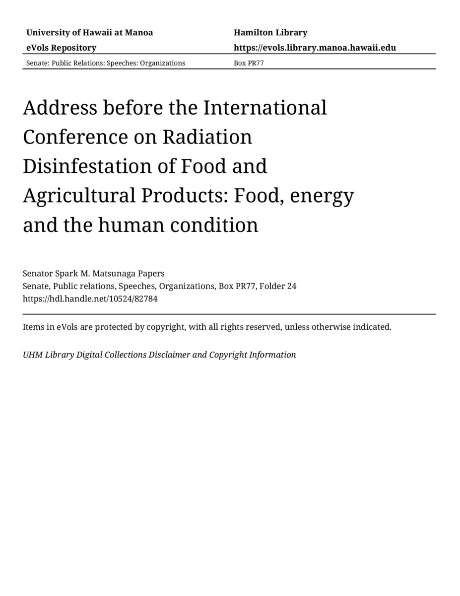 Address before the International Conference on Radiation Disinfestation of Food and Agricultural Products: Food, energy and the human condition, 11/14/83, Senate, Public relations, Speeches, Organizations, Box PR77, Folder 24, Senator Spark M. Matsunaga Papers, Hawaiʻi Congressional Papers Collection, University of Hawaiʻi at Mānoa Library, Honolulu, HI. https://congressarchives.org/catalog/10524_82784 (accessed March 21, 2026).