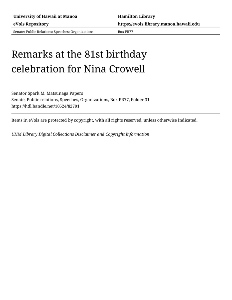Remarks at the 81st birthday celebration for Nina Crowell, 12/17/83, Senate, Public relations, Speeches, Organizations, Box PR77, Folder 31, Senator Spark M. Matsunaga Papers, Hawaiʻi Congressional Papers Collection, University of Hawaiʻi at Mānoa Library, Honolulu, HI. https://congressarchives.org/catalog/10524_82791 (accessed March 21, 2026).