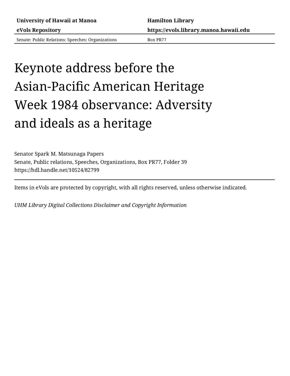 - Keynote address before the Asian-Pacific American Heritage Week 1984 observance: Adversity and ideals as a heritage