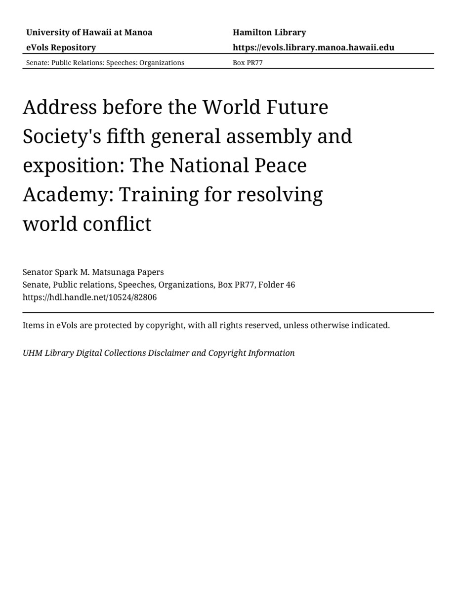 Address before the World Future Society's fifth general assembly and exposition: The National Peace Academy: Training for resolving world conflict, 06/11/83, Senate, Public relations, Speeches, Organizations, Box PR77, Folder 46, Senator Spark M. Matsunaga Papers, Hawaiʻi Congressional Papers Collection, University of Hawaiʻi at Mānoa Library, Honolulu, HI. https://congressarchives.org/catalog/10524_82806 (accessed March 19, 2026).
