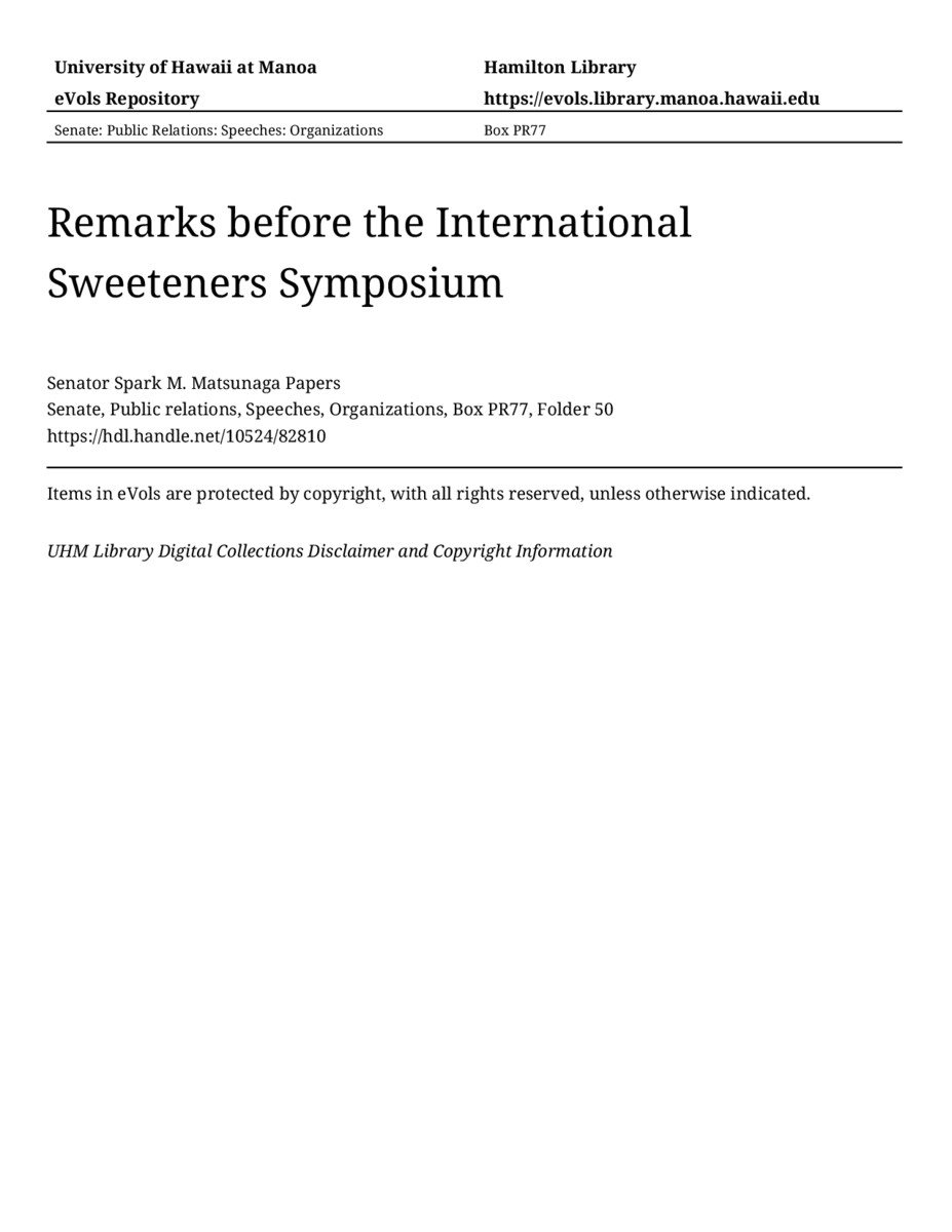 Remarks before the International Sweeteners Symposium, 08/03/84, Senate, Public relations, Speeches, Organizations, Box PR77, Folder 50, Senator Spark M. Matsunaga Papers, Hawaiʻi Congressional Papers Collection, University of Hawaiʻi at Mānoa Library, Honolulu, HI. https://congressarchives.org/catalog/10524_82810 (accessed March 20, 2026).