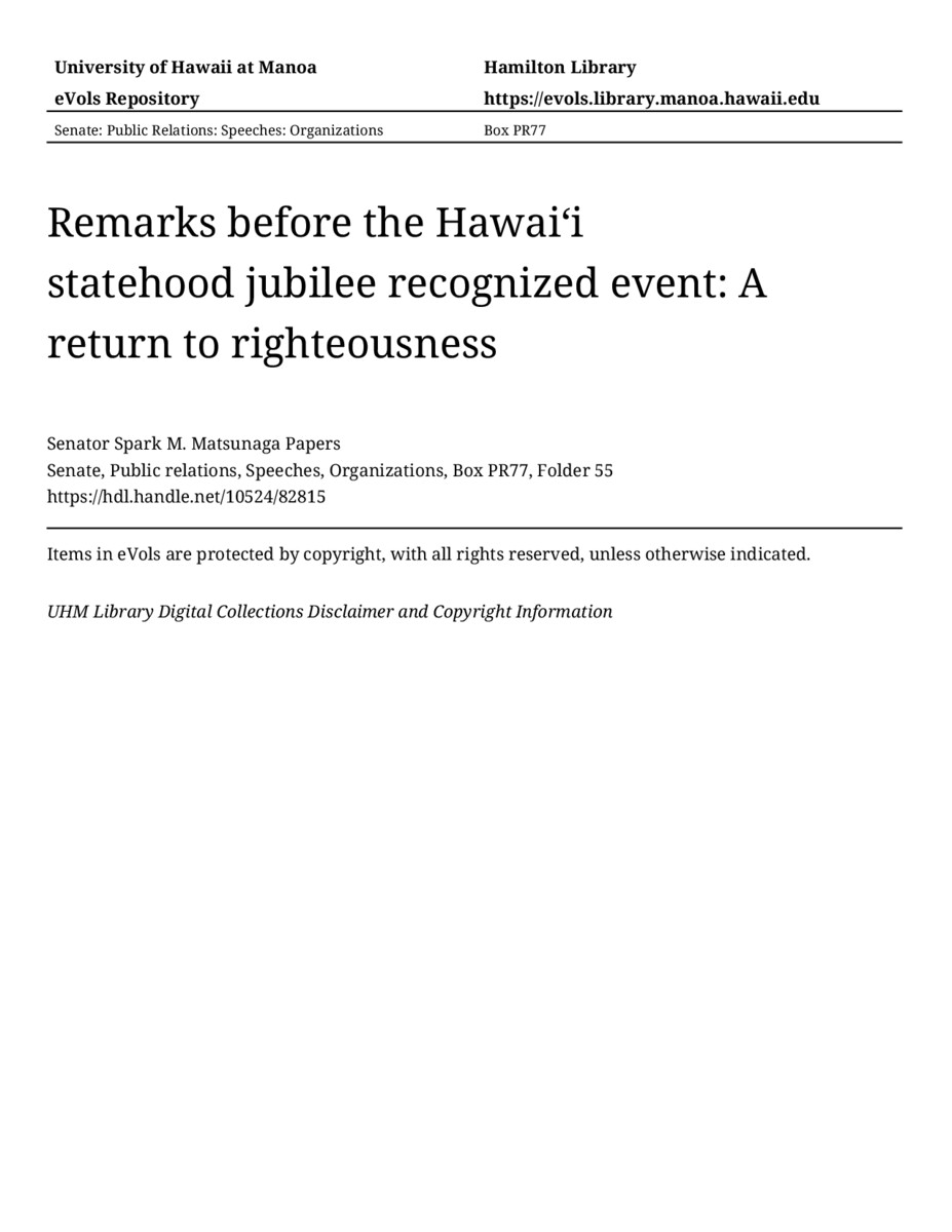 - Remarks before the Hawaiʻi statehood jubilee recognized event: A return to righteousness